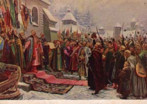 «Навеки с Москвой, навеки с русским народом!» (Михаил Хмелько, 1951—1952, Москва, Государственный исторический музей). Слева изображен Богдан Хмельницкий.