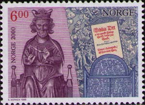 Принятие Норвегией христианства. Статуя короля Олава II и библия Христиана III (1550).