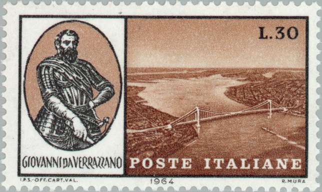 Портрет Джованни да Верраццано, вид на мост Верраццано в Нью-Йорке.