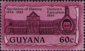 Казнь Дэймона, 1834. Портрет Дэймона и здание парламента в Джорджтауне.