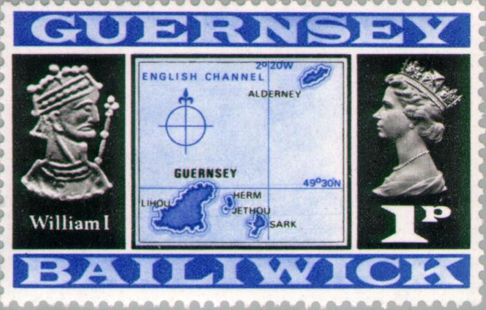 Портреты Вильгельма Завоевателя и Елизаветы II, карта острова Гернси.