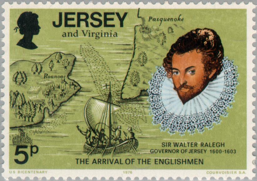 Портрет Уолтера Рели, корабль, приплывающий к побережью Западной Вирджинии.