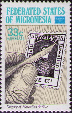 Анджело (член команды Хейса) подделывает голубую марку Гавайев номиналом 5 центов (М5).