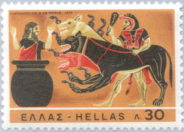 Геракл и Кербер (роспись краснофигурной амфоры «мастера Андрокида», 520—510 до н. э., Париж, Лувр).