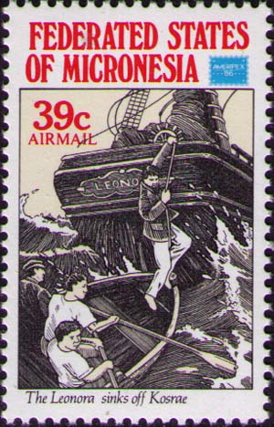 Команда покидает терпящий бедствие корабль Хейса «Леонора» у берега острова Косраэ (ныне — Микронезия).