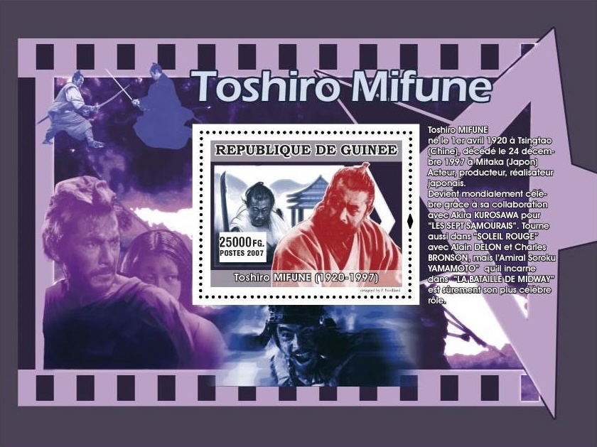 Марка издана в блоке. На поле блока — кадры из фильма «Расёмон».