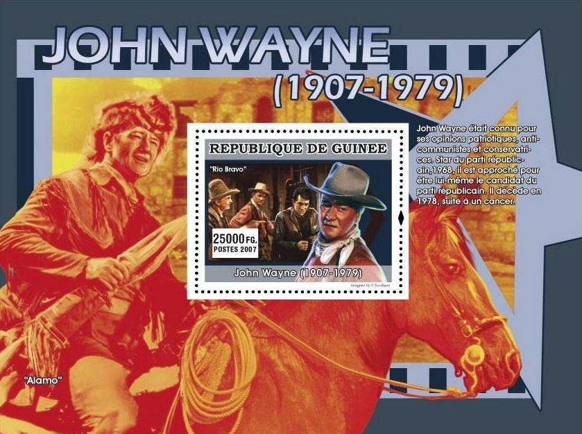Марка издана в блоке. На поле блока — Джон Уэйн в историческом фильме «Аламо».