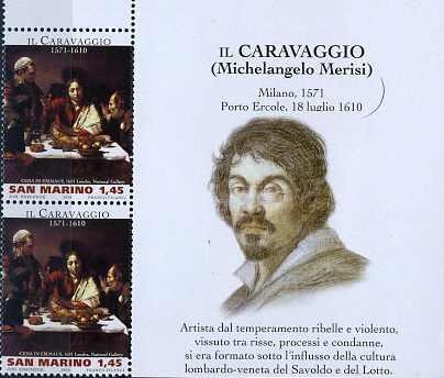 Марка издана в малом листе. На поле листа — портрет Микеланжело Караваджо (Оттавио Леони, около 1621, Флоренция, Библиотека Маруселлиана).