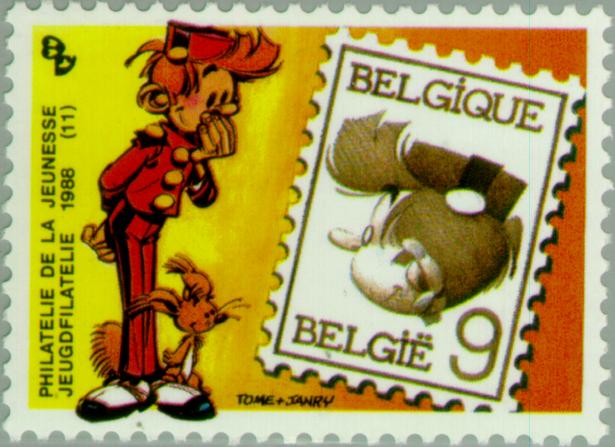 Герои комиксов Спиру и Фантазио у марки с портретом Спиру.
