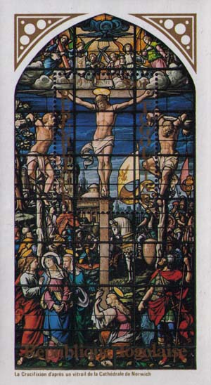 Иисус на кресте (фрагмент витража в соборе Нориджа, Великобритания).