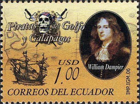 Корабль, пиратская эмблема, портрет Уильяма Дампира на фоне карты.