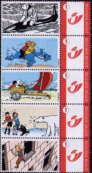 Стандартная марка была выпущена с купономи (дуостамп), на которых изображены фрагменты комикса о Тантане.