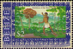 Раб на плантации. По периметру марки — схема размещения рабов в трюме работоргового корабля.