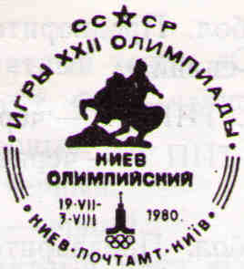 Киев. Игры ХХII олимпиады. Киев Олимпийский. Силуэт памятника Богдану Хмельницкому (скульптор Михаил Микешин, , архитектор В. Н. Николаев, 1870—1888), эмблема Олимпиады.