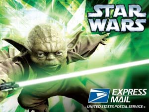 На конверте экспресс-почты: глава Совета джедаев Йода (актер Фрэнк Оз).