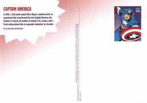 На марке и на карточке: Капитан Америка — герой комиксов.