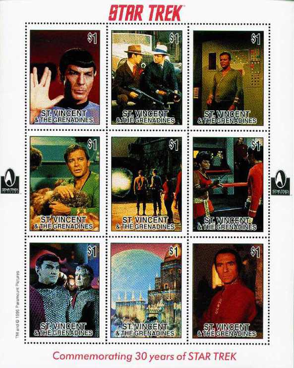 Персонажи телесериала «Звёздный Путь: Оригинальный сериал»: коммандер Спок (актер Леонард Нимой); капитан Джеймс Тиберий Кирк (актер Уильям Шатнер) и коммандер Спок (актер Леонард Нимой), одетые гангстерами; капитан Джеймс Тиберий Кирк (актер Уильям Шатнер) рядом с компьютером; капитан Джеймс Тиберий Кирк (актер Уильям Шатнер) с животным трибблом на руках; капитан Джеймс Тиберий Кирк (актер Уильям Шатнер), коммандер Спок (актер Леонард Нимой) и лейтенант Ухура (актриса Нишель Никольс) перед порталом времени; лейтенант Ухура (актриса Нишель Никольс) и лейтенант Хикару Сулу (актер Джордж Такеи); команда ромулан; инопланетный корабль; генетически созданный совершенный человек Хан Сингх (актер Рикардо Монталбан).