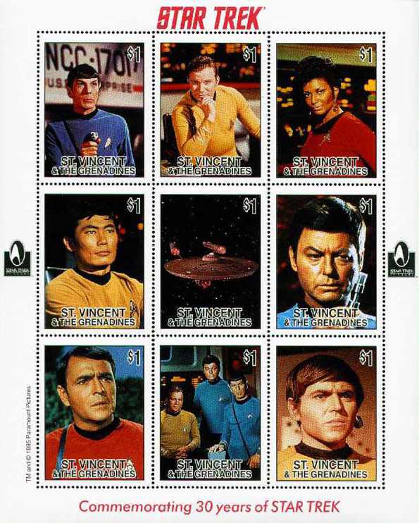 Персонажи телесериала «Звёздный Путь: Оригинальный сериал»: коммандер Спок (актер Леонард Нимой); капитан Джеймс Тиберий Кирк (актер Уильям Шатнер); лейтенант Ухура (актриса Нишель Никольс); лейтенант Хикару Сулу (актер Джордж Такеи); звездолёт Звёздного Флота Объединённой Федерации Планет «Энтерпрайз»; лейтенант-коммандер доктор Леонард «Боунз» МакКой (актер ДеФорест Келли); лейтенант-коммандер Монтгомери Скотт (актер Джеймс Духан); капитан Джеймс Тиберий Кирк (актер Уильям Шатнер) коммандер Спок (актер Леонард Нимой) и лейтенант-коммандер доктор Леонард «Боунз» МакКой (актер ДеФорест Келли); навигатор Павел Чехов (актер Уолтер Кениг).