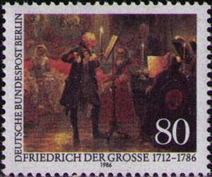 «Концерт для флейты в Сан-Суси» (Адольф Фридрих Эрдманн фон Мензель, 1852, Берлин, Старая Национальная галерея, фрагмент). Фридрих II играет на флейте.