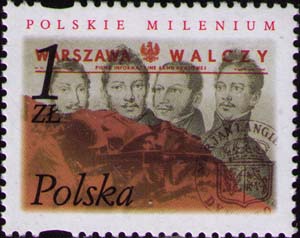 Участники штурма дворца Бельведер (резиденции Великого князя Константина) 39 ноября 1830: Карол Панкевич, Валентий Кросновский, Винсентий Кобилянский, Александр Светославский (литография Виллана). Печать Мариана Лангиевича, диктатора начального периода январского восстания 1863. На заднем плане — газета Армии Крайовой «Warszawa Walczy». В нижней части марки — момент Варшавского восстания 20 августа 1944 (фотография Януша Сегейла).