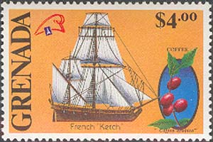 Французский кеч, плоды кофейного дерева и эмблема выставки.