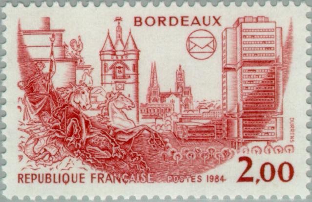 На марке изображены различные достопримечательности города Бордо, где проходила филателистическая конференция. Одной из них является памятник Жирондистам Республики (Le monument aux Girondins et à la République). Он возведен в честь деятелей Французской Революции, погибших во времена кровавого террора. Монумент величественно возвышается в центре площади Кенконс. Памятник представляет собой колонну высотой 50 метров, которую венчает статуя, олицетворяющая собой Свободу. У подножия памятника, с двух сторон колонны, располагаются прекрасные фонтаны, украшенные бронзовыми скульптурными группами. Создание памятника относится к 1894–1902. Авторами монумента были архитектор Виктор Рич и Альфонс Дюмилтр, скульптурные группы были созданы Феликсом Шарпантье и Густавом Дебри – именно он был создателем морских коней – шедевра этих композиций. Скульптурные группы наделены глубоким аллегорическим смыслом. В центре композиции женская фигура – символизирует триумф Республики. Четверка морских коней со змеиными хвостами, из ноздрей которых бьют струи воды, гонит прочь, низвергает в пучину Ложь с маской в руках, Безразличие и Глупость с ослиными ушами. Второй фонтан имеет схожую композицию, но в нее заложен совсем другой смысл: женщина с оливковой ветвью – триумф Согласия. Все фигуры олицетворяют собой мир и благополучие, перед квадригой счастливая семья с ребенком, беззаботно играющим с рыбой. Во время II Мировой Войны бронзовые лошади и другие элементы фонтана были демонтированы немцами, которые планировали их переплавку в военных целях. К счастью этого так и не произошло. В 1983 после реставрационных работ памятник был полностью восстановлен. Он по праву считается одной из главных достопримечательностей города.