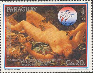 «Вакханка» (Леон Ризенер, 1855, Париж, Лувр, зеркальное изображение), эмблема юбилея Революции.