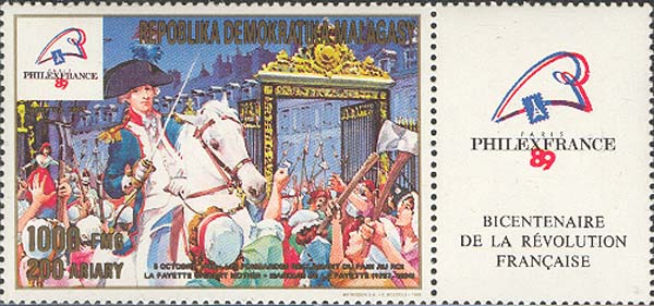 Марка также издана в блоке. На поле блока — возвращение короля в Версаль 6 октября 1789. В карете видны Людовик XVI и Мария-Антуанетта.