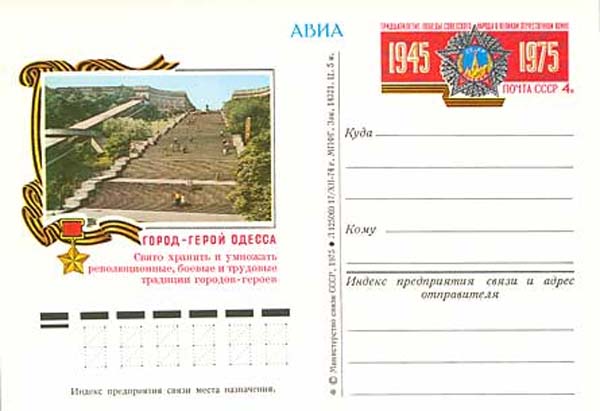На карточке: Одесса. Потемкинская лестница. Наверху лестницы — памятник герцогу Ришелье (скульптор Иван Мартос, архитектор А. И. Мельников, 1828).