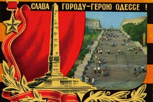 Слава городу-герою Одессе!. Потемкинская лестница (архитектор Ф. К. Боффо, 1834—1841). Наверху лестницы — памятник герцогу Ришелье (скульптор Иван Мартос, архитектор А. И. Мельников, 1828). Художник Ю. Бронфенбренер. Фото И. Кропивницкого.