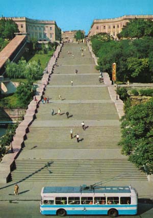Одесса. Потемкинская лестница (архитектор Ф. К. Боффо, 1834—1841). Наверху лестницы — памятник герцогу Ришелье (скульптор Иван Мартос, архитектор А. И. Мельников, 1828). Фото Е. Света.