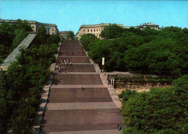 Одесса. Потемкинская лестница (архитектор Ф. К. Боффо, 1834—1841). Наверху лестницы — памятник герцогу Ришелье (скульптор Иван Мартос, архитектор А. И. Мельников, 1828). Фото В. Киселева.