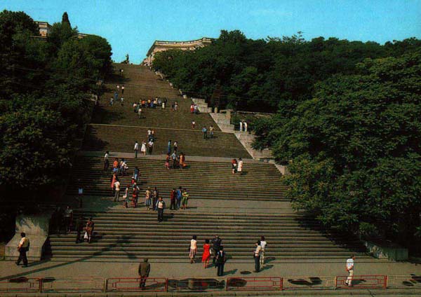 Одесса. Потемкинская лестница (архитектор Ф. К. Боффо, 1834—1841). Наверху лестницы — памятник герцогу Ришелье (скульптор Иван Мартос, архитектор А. И. Мельников, 1828). Фото В. Киселева.