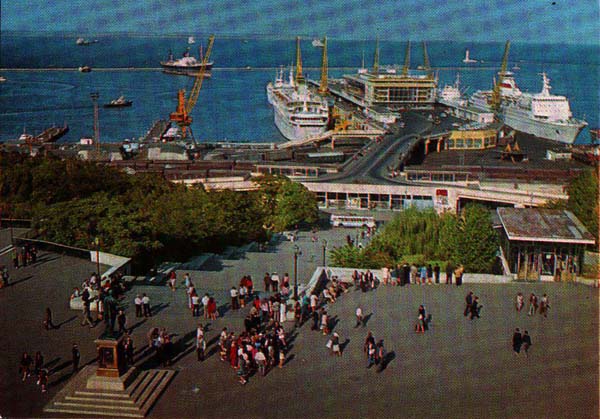 Одесса. Морской вокзал. Слева — памятник герцогу Ришелье (скульптор Иван Мартос, архитектор А. И. Мельников, 1828). Фото И. Кропивницкого.