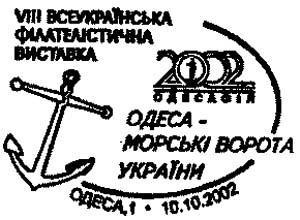 Одесса. VIII национальная филателистическая выставка «Одесафiл 2002». Одесса —морской порт Украины. Эмблема выставки — силуэт памятника герцогу Ришелье (скульптор Иван Мартос, архитектор А. И. Мельников, 1828).