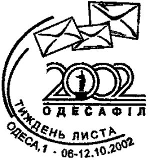 Одесса. VIII национальная филателистическая выставка «Одесафiл 2002». Неделя письма. Эмблема выставки — силуэт памятника герцогу Ришелье (скульптор Иван Мартос, архитектор А. И. Мельников, 1828).