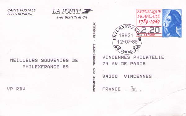 На обороте карточки: эмблема филателистической выставки «Philexfrance'89».