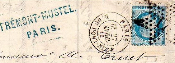 Париж. Почтовое отделение «Pont Neuf» (календарный штемпель почтового отделения, существовавшего в конце XIX века). Надпись «R. du Pont Neuf»/