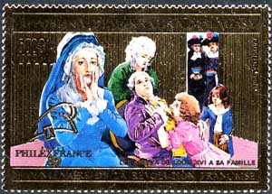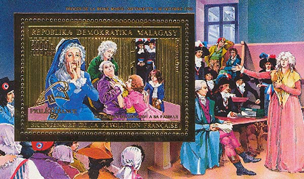 Марка выпущена в блоке. На поле блока — процесс над Марией-Антуанеттой 16 октября 1993.