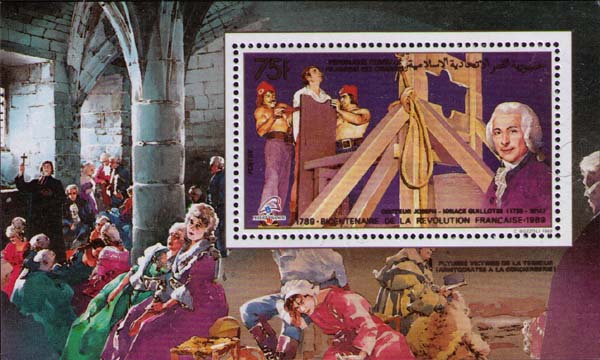Марка издана в малом листе и в блоке. На поле блока — жертвы террора (аристократы в тюрьме Консьержери).